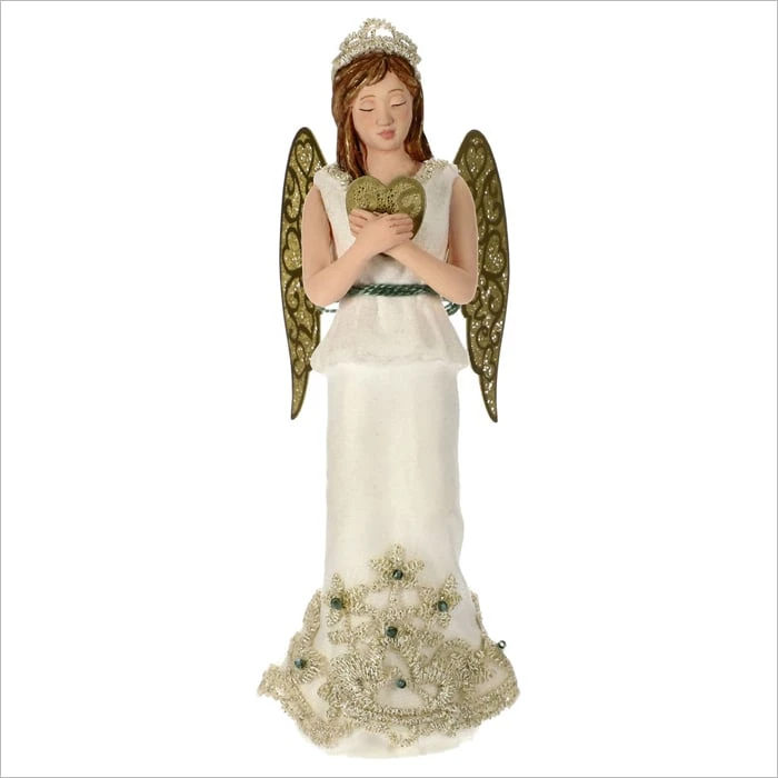 Let this beautiful angel fill your heart with peace this holiday season. She holds a filigree heart symbol in her crossed hands, inviting you to reflect on her heavenly beauty. Metal wings, glitter, appliqué trim and fabric ribbon add extra sparkle to this ethereal Christmas tree ornament. 2nd in the Christmas Angels series.
