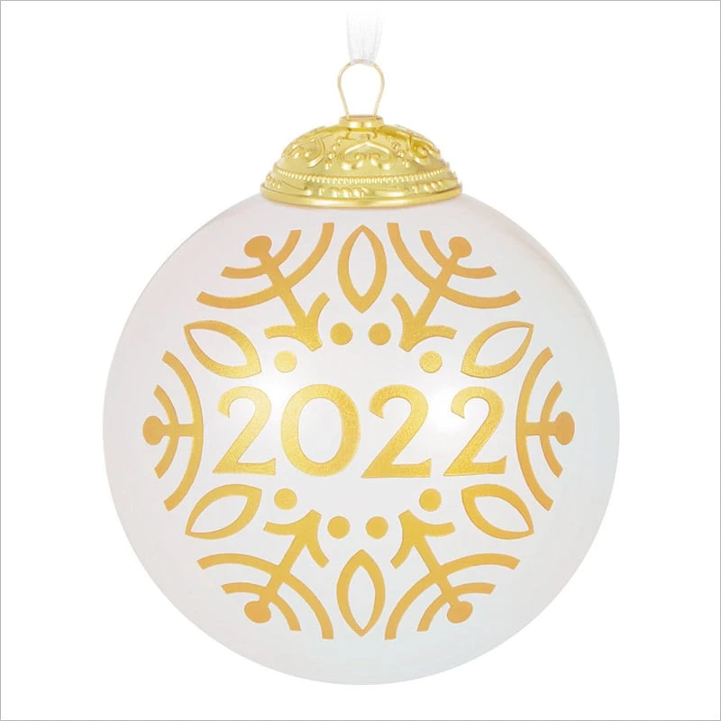 Celebrate the festive moments and bright memories that 2022 has brought to you and your family with this commemorative Christmas tree ornament. The pearlized ivory translucent glass ball features an etched gold snowflake design around the date and an embossed metal cap. Year dated 2022.