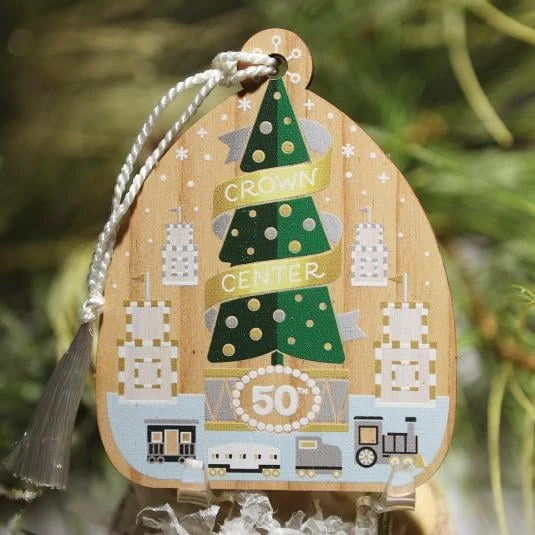 The 2022 ornament, “Celebrating 50 Years,” was designed by Hallmark Artist Sheyda Best. The laser-cut design features the Mayor’s Christmas Tree in green with some of Crown Center’s iconic holiday decorations in gold, silver and white. This ornament celebrates the 50th year that the Mayor’s Christmas Tree will stand in Crown Center Square.